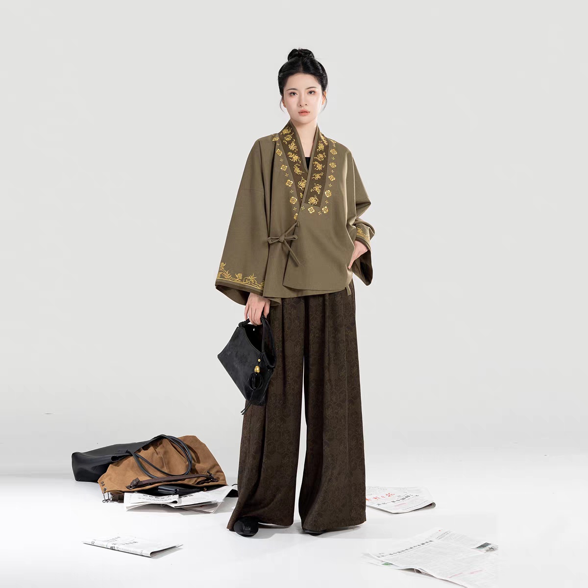新中式配套八仙龟背绣花交领外套上衣阔腿裤长裤女S-L